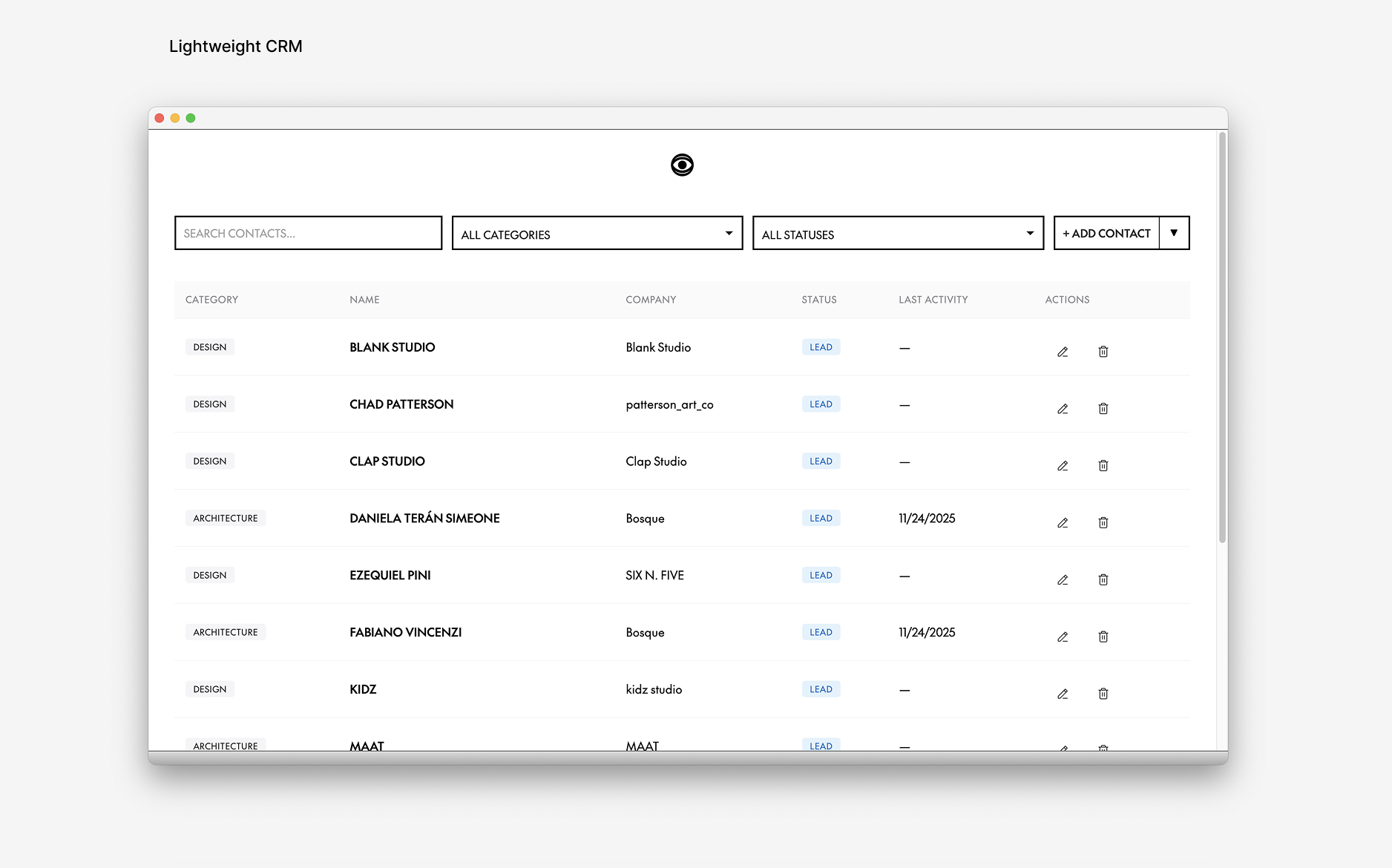 Built a simple local-first CRM using a single-page HTML5 structure powered by IndexedDB for persistent, client-side data storage, ensuring zero reliance on external servers. Features a complete CRUD system for managing contacts and activities, enhanced by real-time search and multi-dimensional filtering implemented in basic JavaScript. Fully offline, standalone Mac desktop experience.